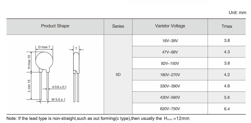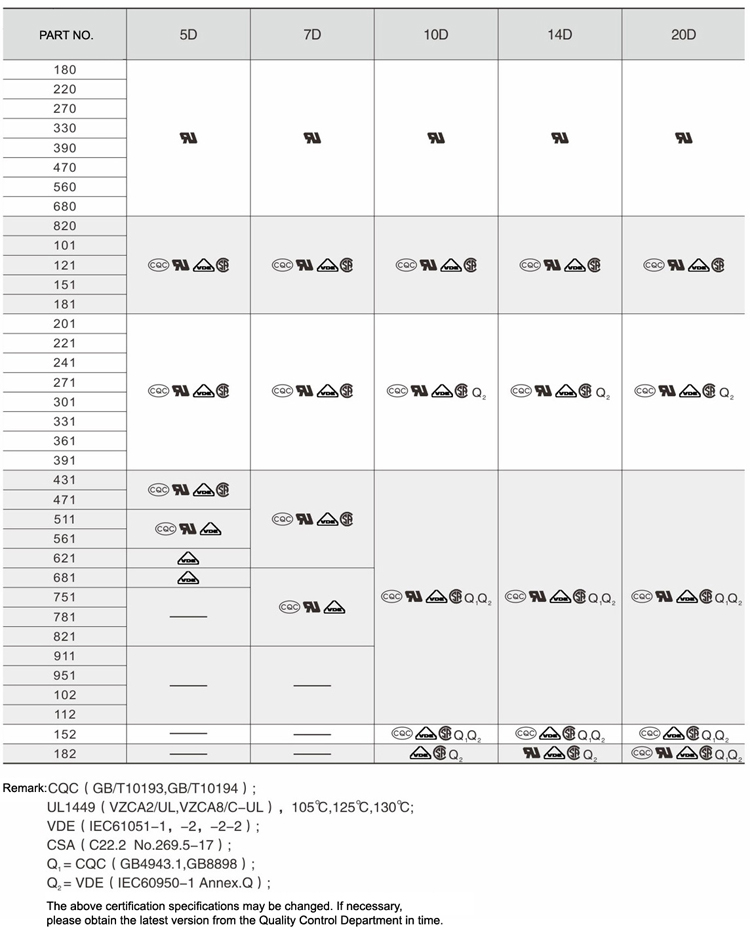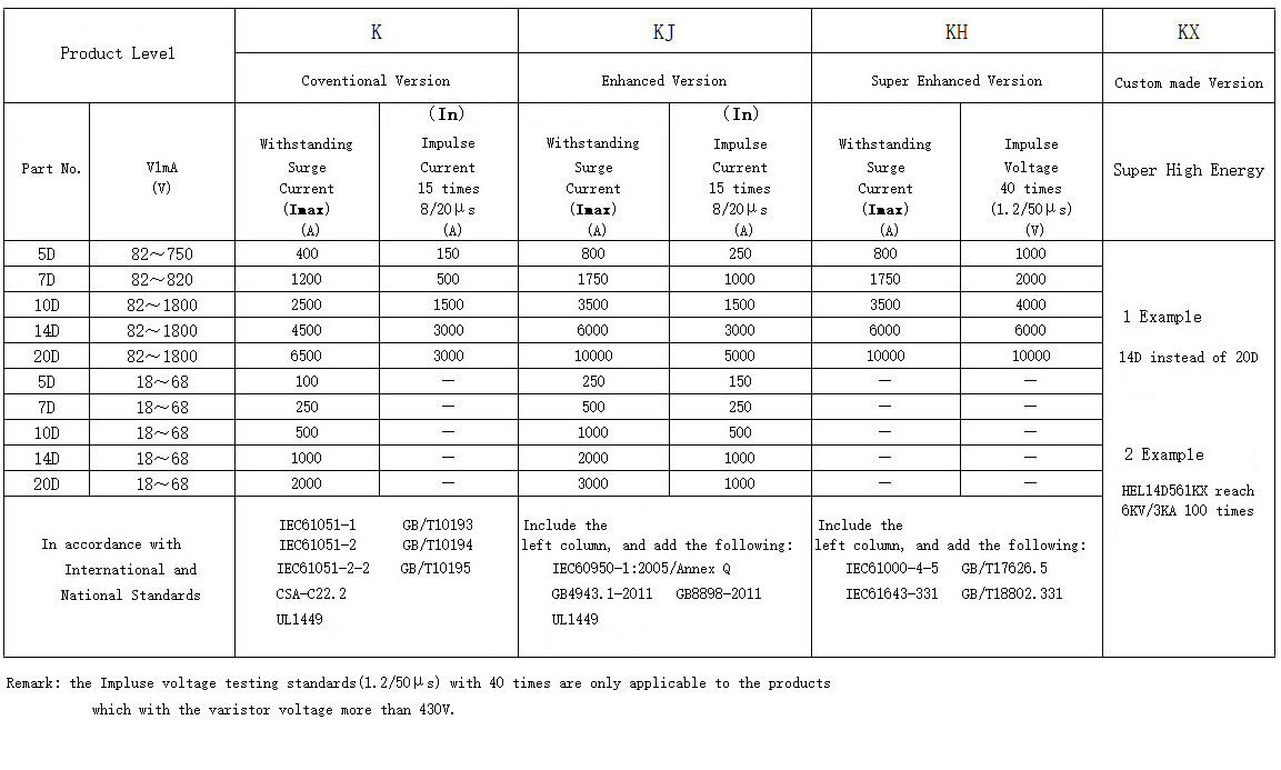 | Part No. | Varistor Voltage | Maximum Allowable Voltage | Maximum Clamping Voltage | Withstanding Surge Current | Rated Wattage | Energy | Typical Capacitance | Datasheet Download | ||
