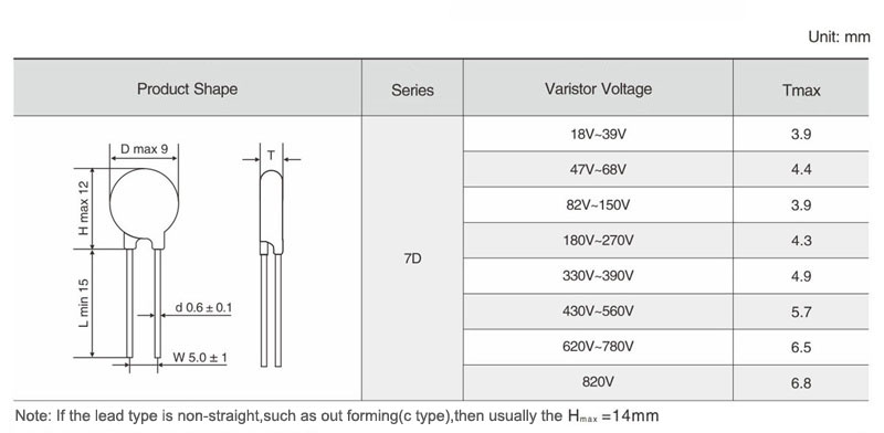 | Part No. | Varistor Voltage | Maximum Allowable Voltage | Maximum Clamping Voltage | Withstanding Surge Current | Rated Wattage | Energy | Typical Capacitance | Datasheet Download | ||