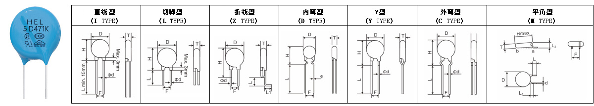 | 型號規(guī)格 | 壓敏電壓 | 最大允許使用電壓 | 最大限制電壓 | 通流容量 | 電極種類 | 包裝方式 | 產(chǎn)品外形 | 是否 切短腳 |