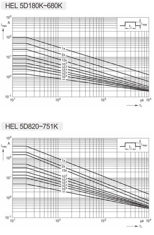 14D滿足20D的 脈沖性能要求 14D instead of 20D 舉例2 Example HEL14D561KX能達到 6KV/3KA 100次 HEL14D561KX reach 6KV/3KA 100 times? |