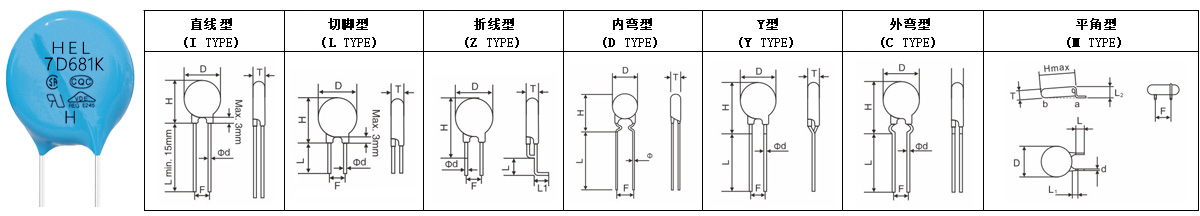 | 型號規(guī)格 | 壓敏電壓 | 最大允許使用電壓 | 最大限制電壓 | 通流容量 | 電極種類 | 包裝方式 | 產(chǎn)品外形 | 是否 切短腳 |